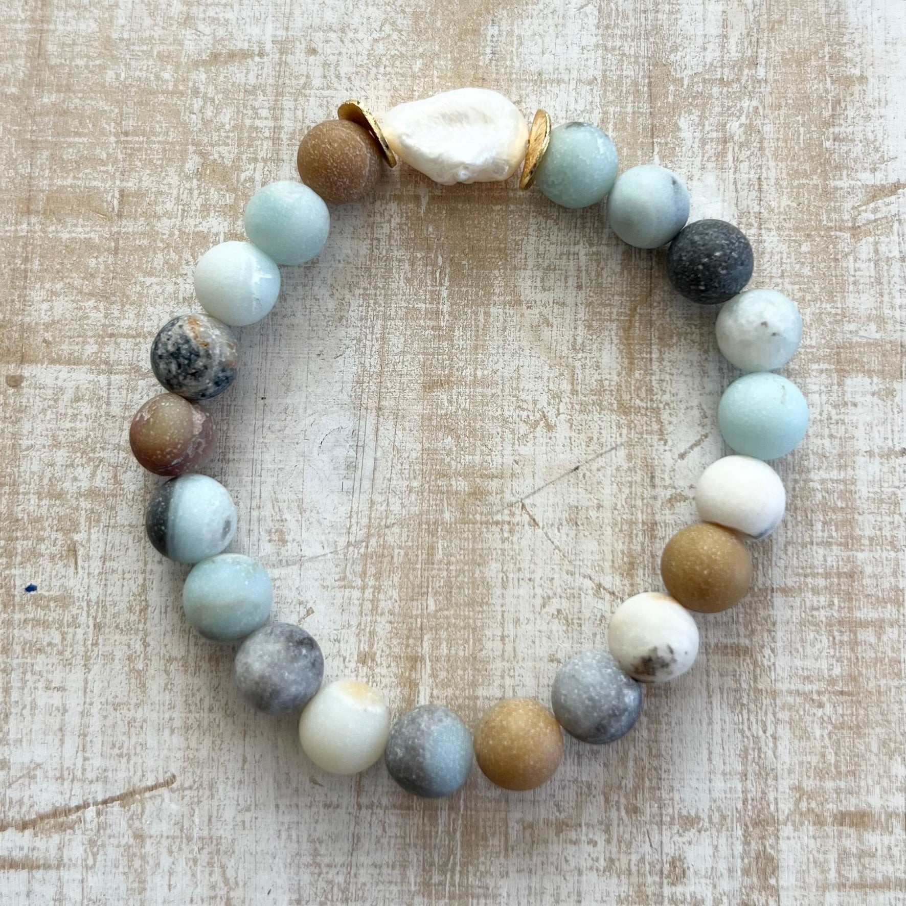 Hand beaded Matte Amazonite, Fresh Water Pearl and Brushed Gold Wavy Discs. Stretch bracelet made with 8mm beads and measures 7", sized to fit most wrists.