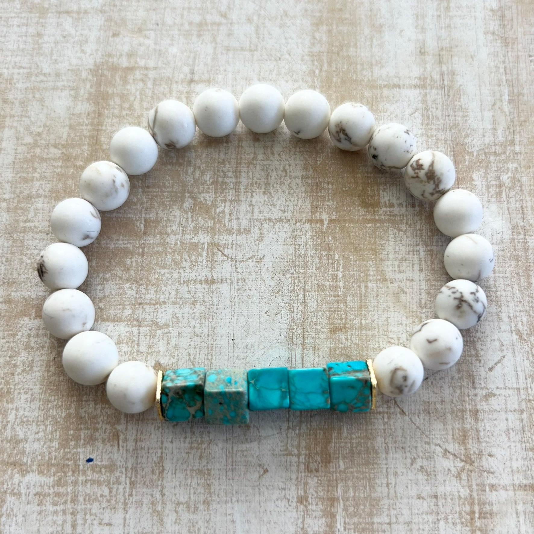 Hand beaded Howlite, Cubed Blue Jasper & Brushed Gold spacers. Stretch bracelet made with 8mm beads and measures 7", sized to fit most wrists.