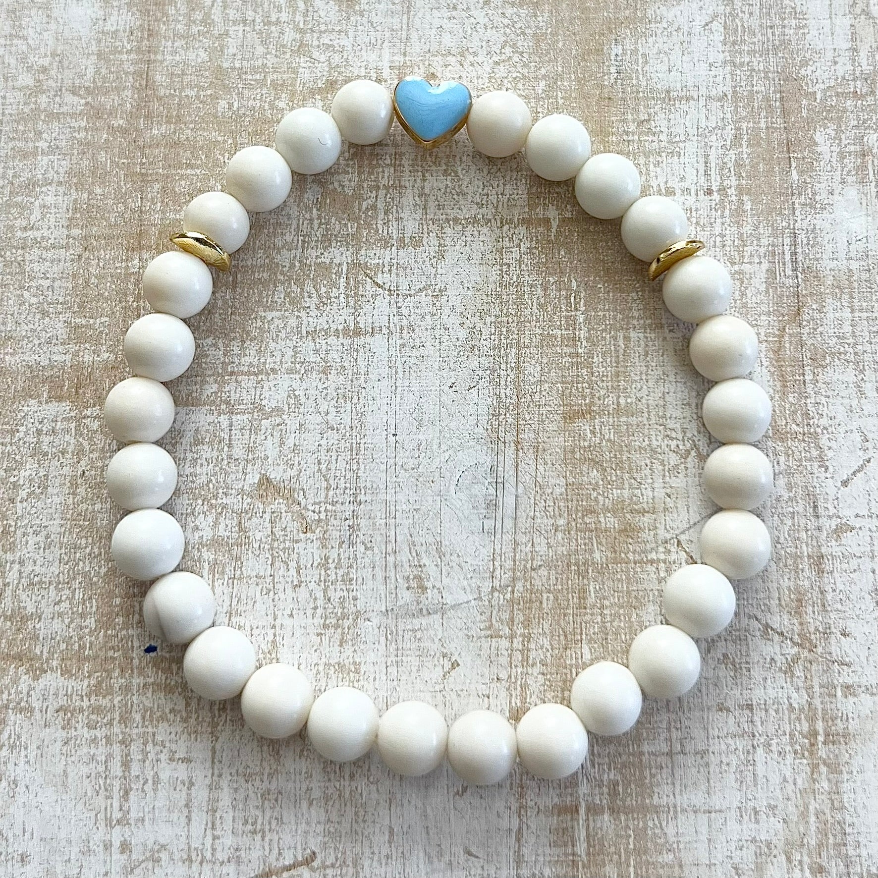 Hand beaded Ivory Jasper with a Gold Filled Blue Enamel Heart Bead. Stretch bracelet made with 6mm beads and measures 7", sized to fit most wrists.