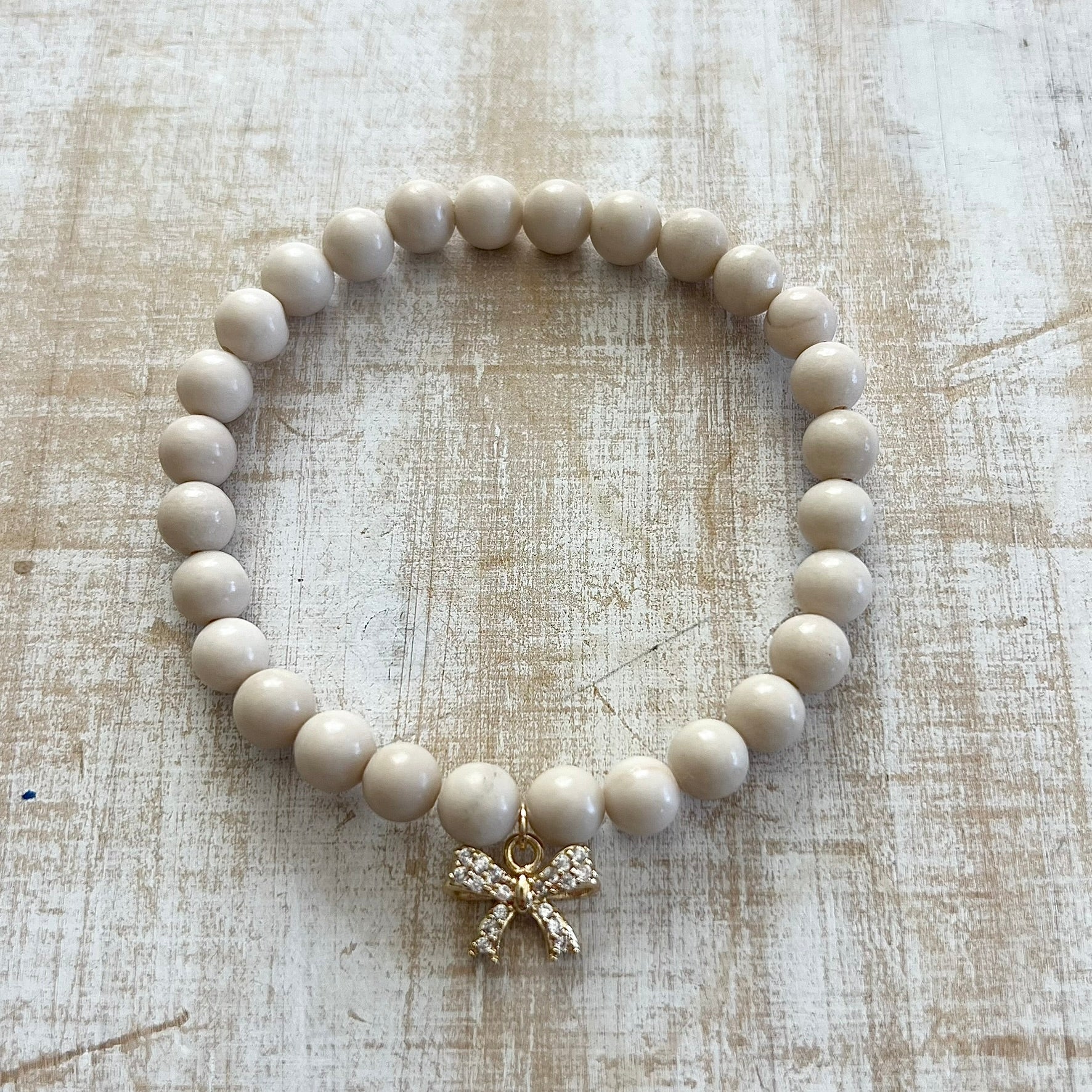 Hand beaded Riverstone & a Gold Crystal Bow charm. Stretch bracelet made with 6mm beads and measures 7", sized to fit most wrists.